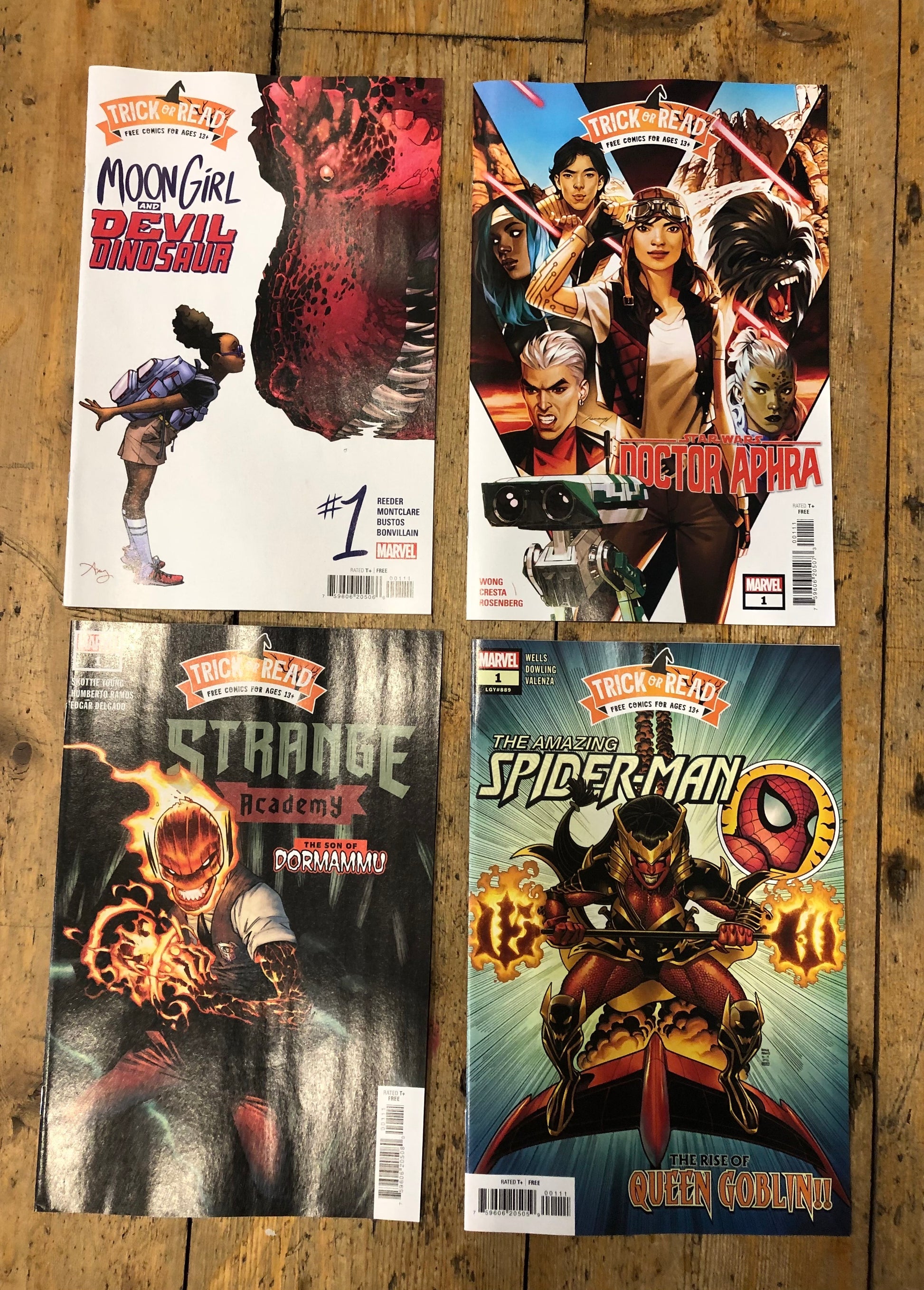 4 PACK 2022 MARVEL TRICK OR READ STAR WARS DOCTOR APHRA/STRANGE ACADEMY/MOON GIRL & DEVIL DINOSAUR/AMAZING SPIDER-MAN