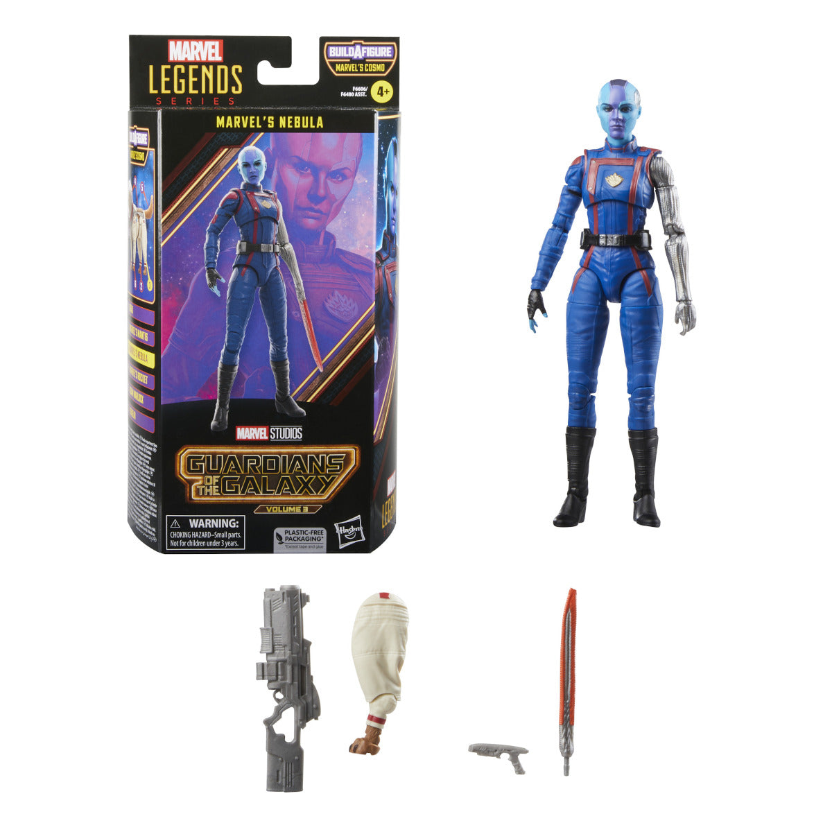 Since helping the Avengers defeat her adoptive father, Nebula has become a full-fledged member of the Guardians of the Galaxy who show her the true meaning of family. This collectible 6-inch-scale Marvel Legends figure is detailed to look like the Marvel's Nebula character from Marvel Studios' Guardians of the Galaxy Vol. 3, featuring premium detail, multiple points of articulation, and 4 movie-inspired accessories, including two blaster accessories.